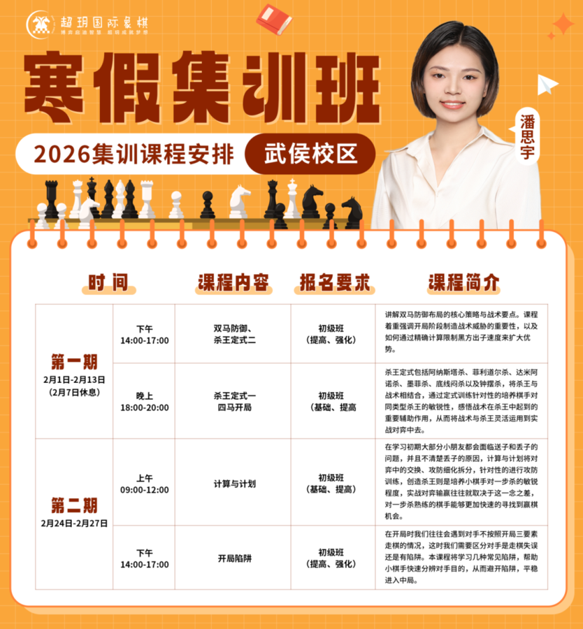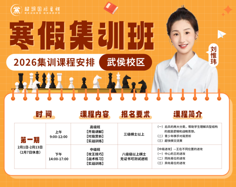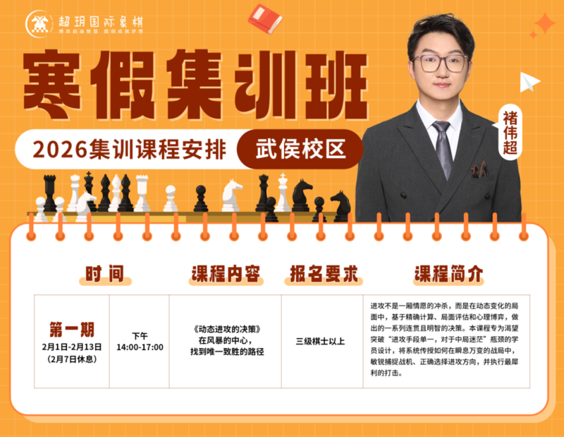 寒假是棋童们悄然拉开差距的时期 一个高效的棋艺提升计划必不可少! 超玥国际象棋2026寒假集训报名通道已开启 无论您的孩子是零基础入门,还是已有基础想进一步提升 我们都能精准匹配棋力水平,量身定制学习方案! 赶紧查看课程详情,锁定心仪课程,抓住寒假学棋黄金期吧! 武侯校区课程安排 01———————————褚伟超老师