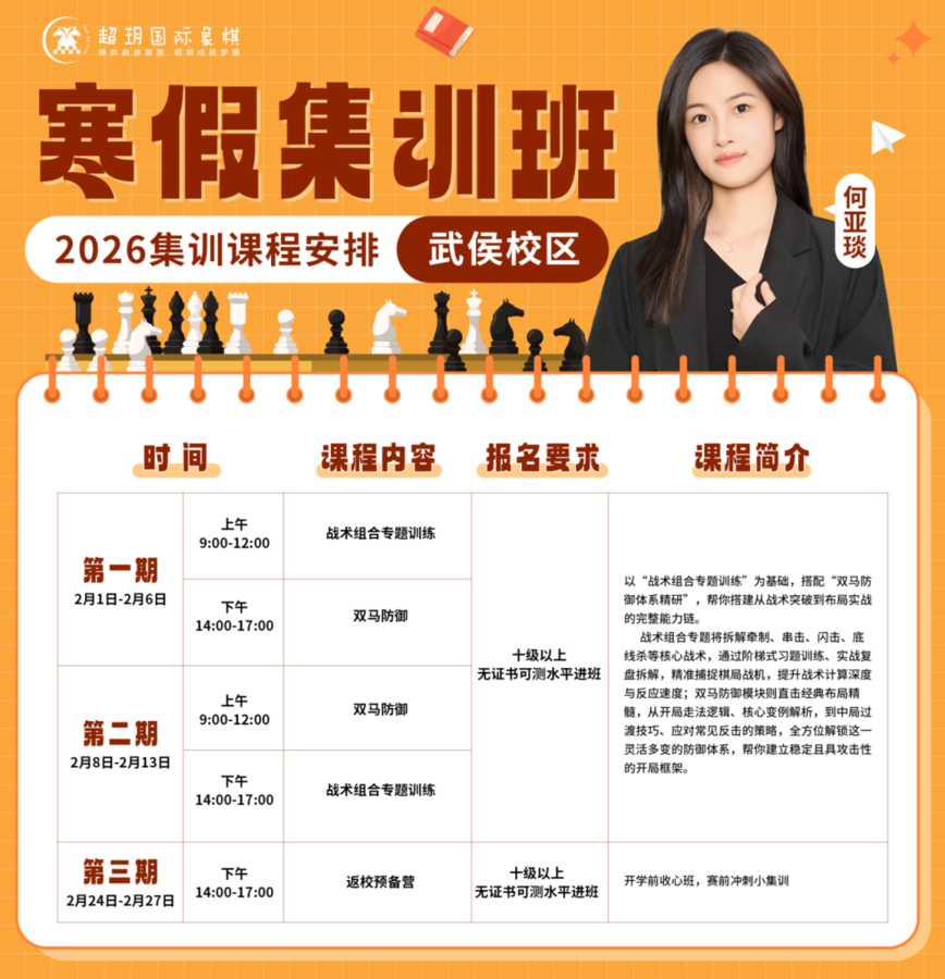 当前位置: > 新闻详情 【武侯校区】高效寒假,棋力蜕变!超玥国际象棋2026寒假集训报名啦!发表时间:2025-11-29 10:10