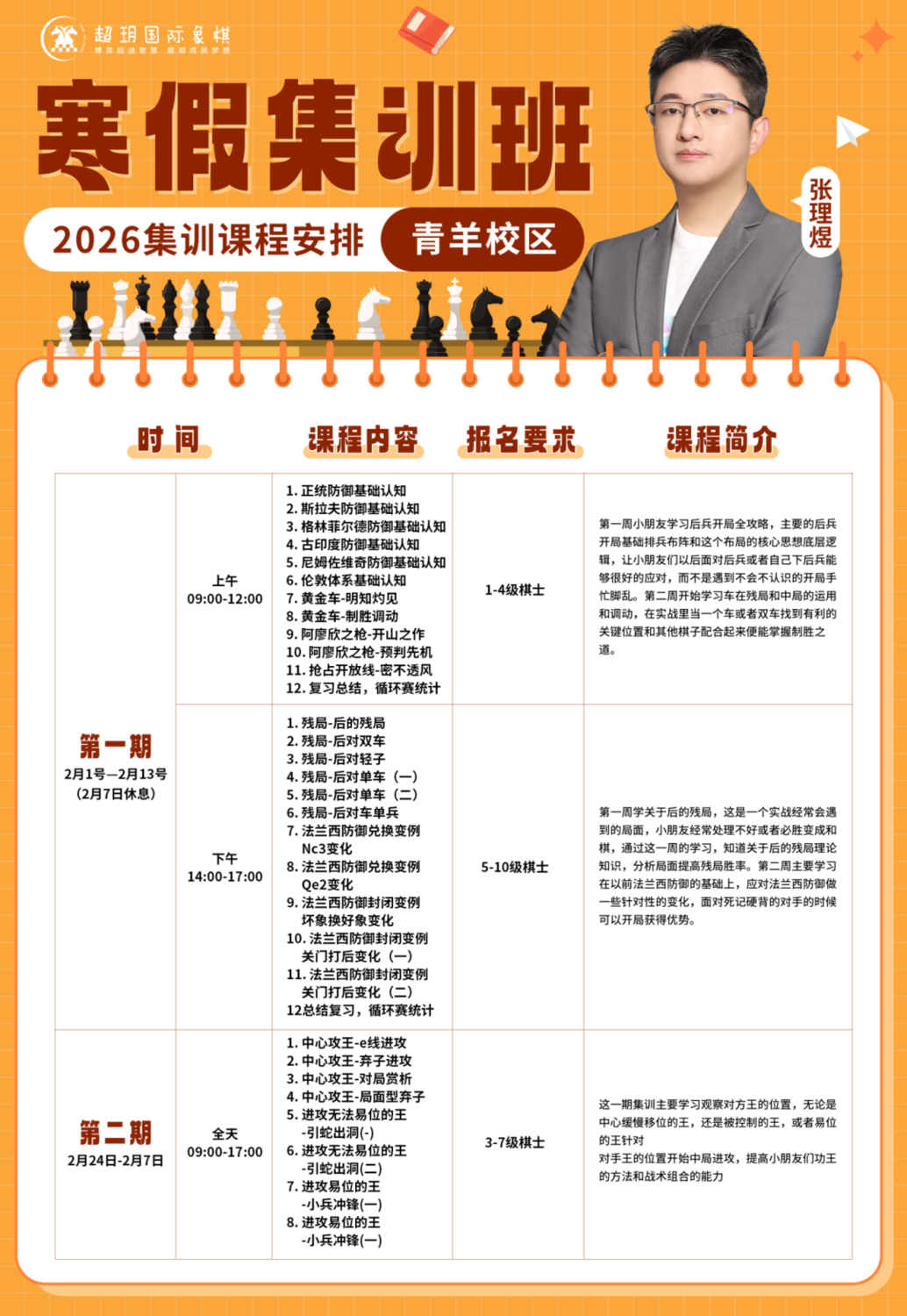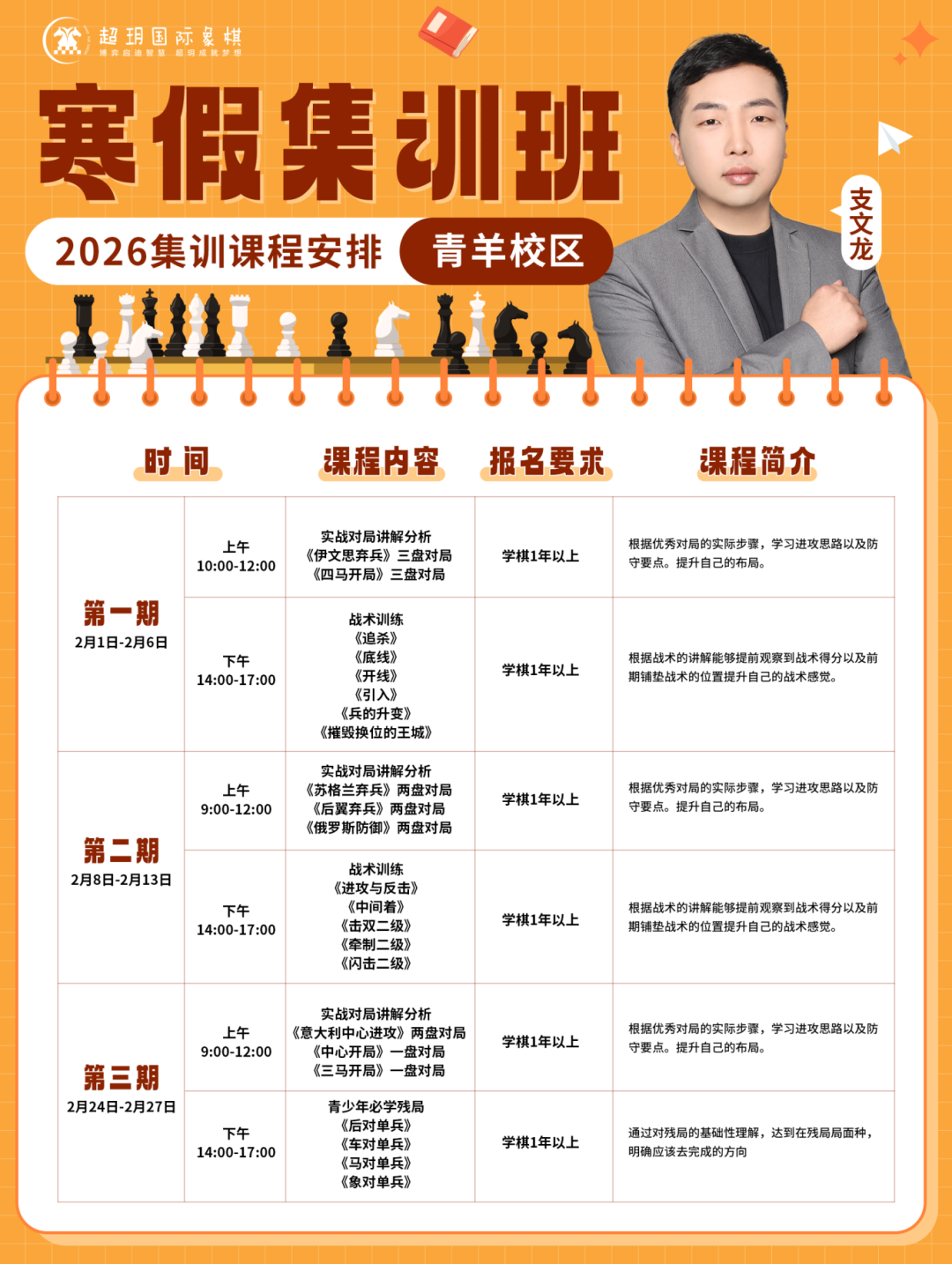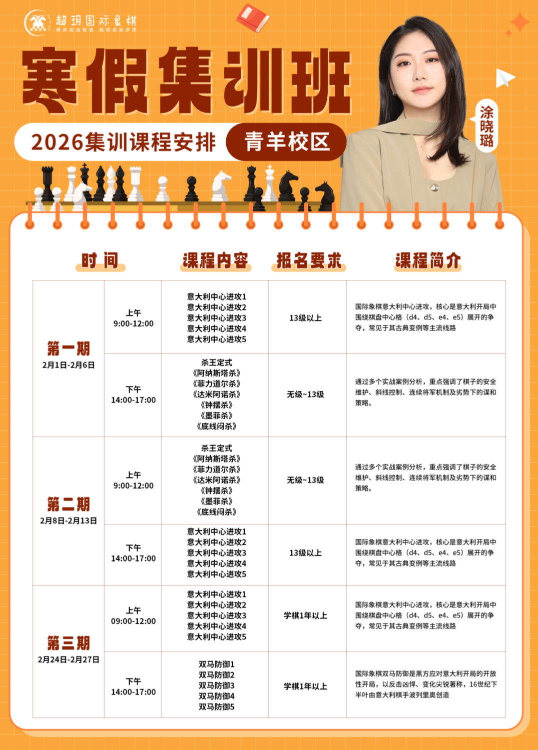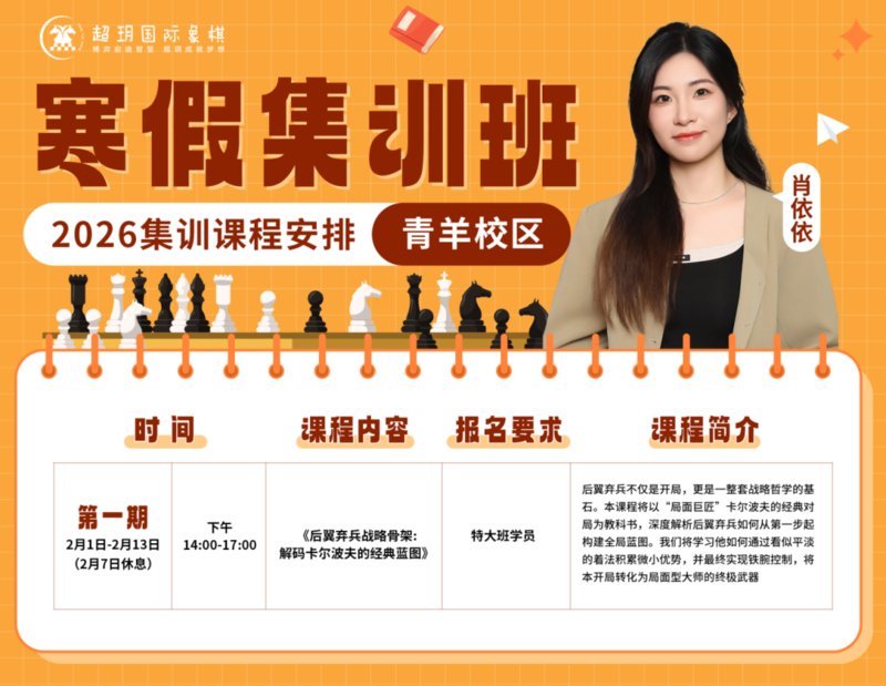 寒假是棋童们悄然拉开差距的时期 一个高效的棋艺提升计划必不可少! 超玥国际象棋 2026寒假集训报名通道已开启 无论您的孩子是零基础入门 还是已有基础想进一步提升 我们都能精准匹配棋力水平 量身定制学习方案! 赶紧查看课程详情,锁定心仪课程吧! 青羊校区课程安排 01——————————肖依依老师
