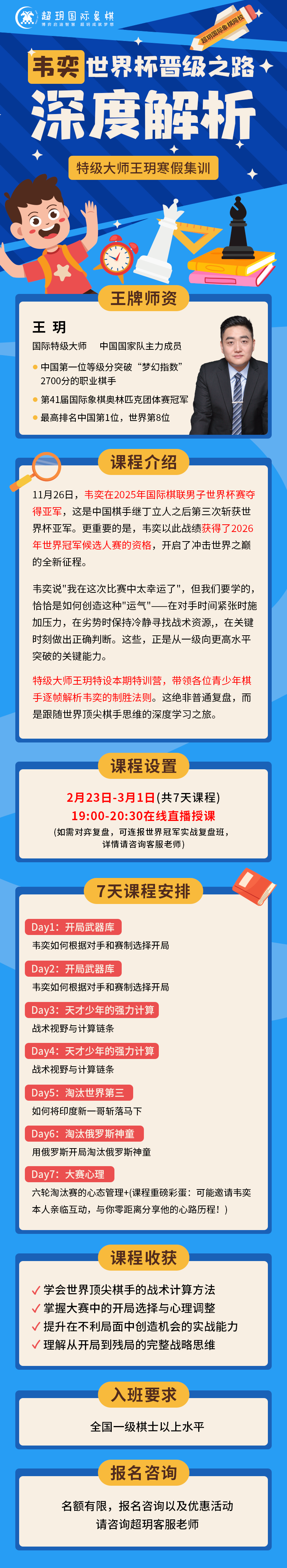 本次寒假集训,特级大师王玥将深度解析韦奕世界杯的晋级之路, 带领孩子们跟随世界顶尖棋手的思维深度学习,从一级水平向更高水平突破! 集训详情
